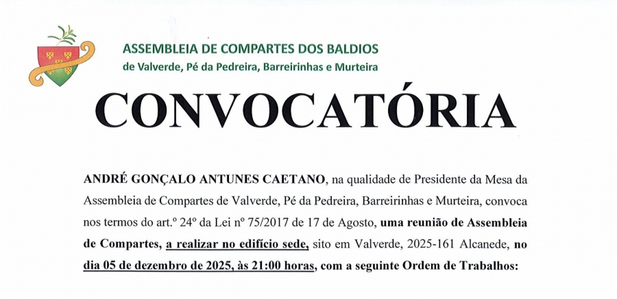 b) Caso não se verifique quórum para o funcionamento da assembleia nos termos da alínea anterior, o Presidente da Assembleia convocará de imediato uma nova reunião para um dos cinco a catorze dias seguintes, para a qual fica desde já designado o dia 14 de dezembro de 2025, às 15:00 horas, no mesmo local, e que funcionará à hora marcada, com qualquer número de compartes presentes.