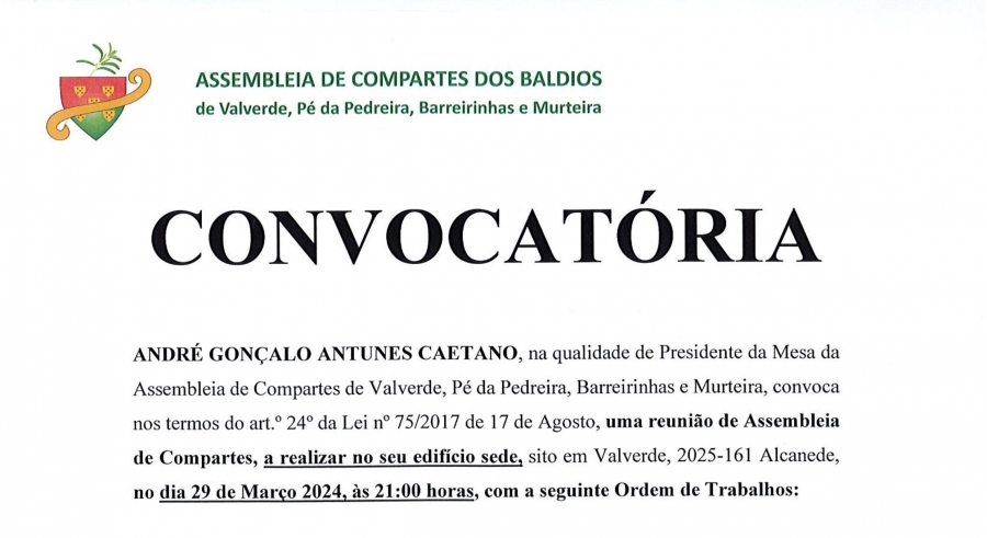 b) Caso não se verifique quórum para o funcionamento da assembleia nos termos da alínea anterior, o Presidente da Assembleia convocará de imediato uma nova reunião para um dos cinco a catorze dias seguintes, para a qual fica desde já designado o dia 07 de Abril de 2024, às 15:30 horas, no mesmo local, e que funcionará à hora marcada, com qualquer número de compartes presentes.