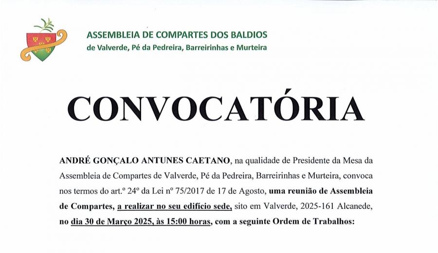 No próximo dia 30 de Março de 2025 às 15:00 horas, vai realizar-se uma reunião de Assembleia de Compartes, no seu edifício sede, sito em Valverde, 2025-161 Alcanede, com a seguinte Ordem de Trabalhos:
